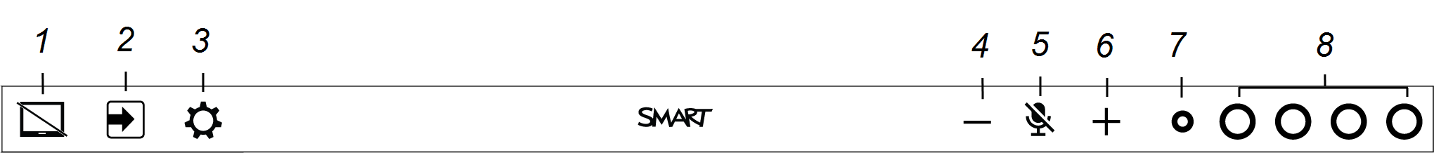 The utility bar contains buttons for turning the screen on and off, switching inputs, and accessing the interactive podium's on-screen display settings. You can also control the volume, microphone array, and ink colors.