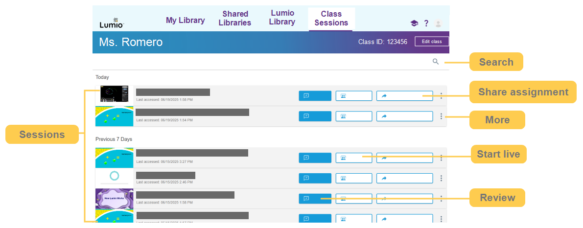 Search | Click Search Tip If you’ve renamed your sessions to include an identifier (e.g. Period 1, Section 1), you can search by that identifier and see the list of sessions for that class. ![]() |