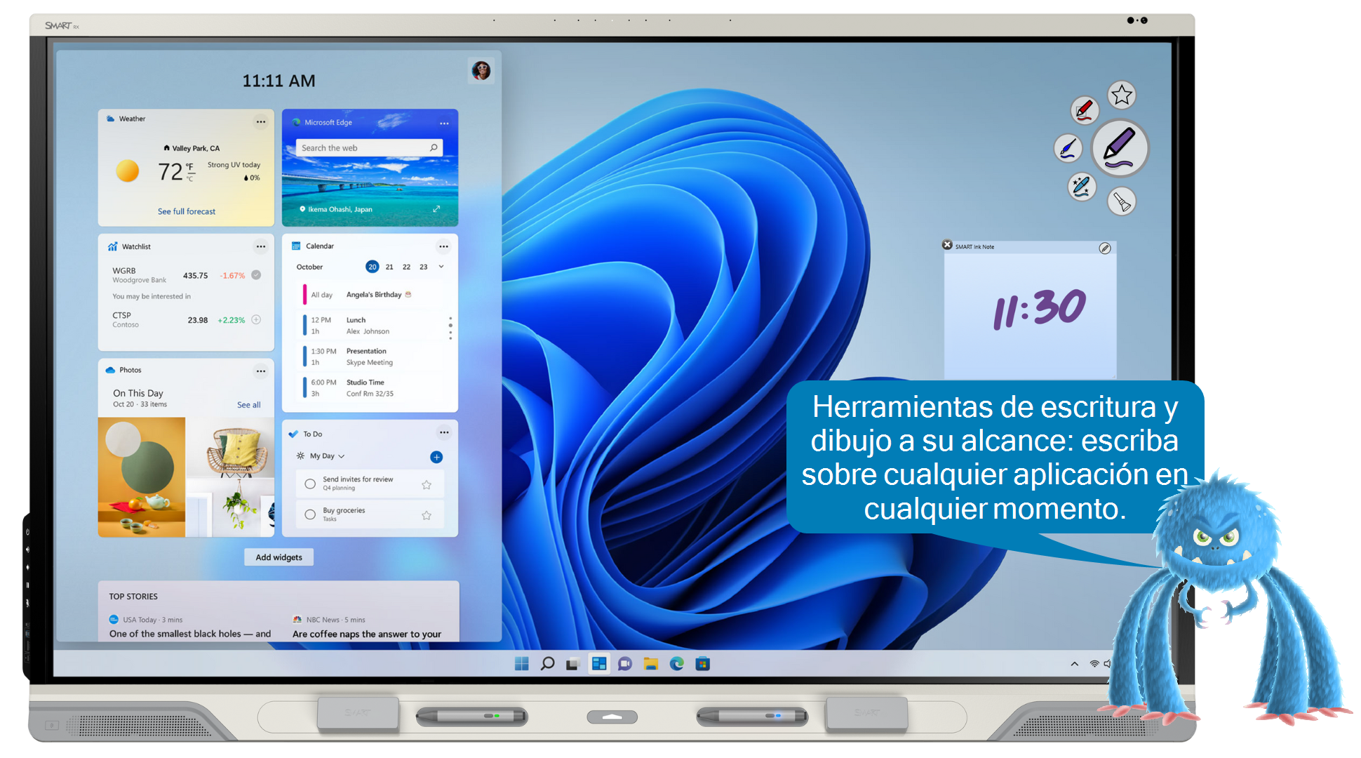| 1 | Recoger y escribir ![]() Cuando coge uno de los rotuladores de la pantalla, aparece la barra de herramientas dinámicas de SMART Ink. Comience a escribir, incluso en el escritorio. |