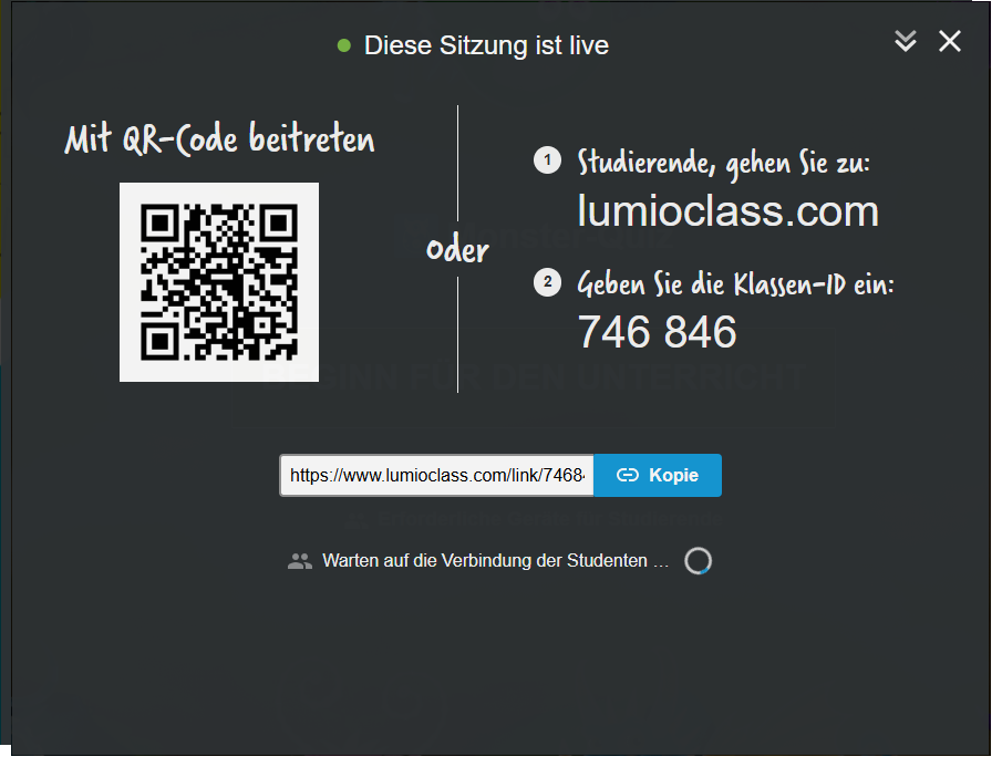 Minimieren oder schließen Sie die Verbindungsinformationen der Schülerinnen und Schüler und beginnen Sie mit der Live-Zustellung.