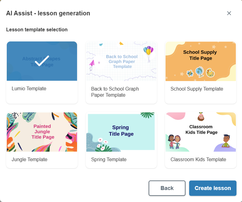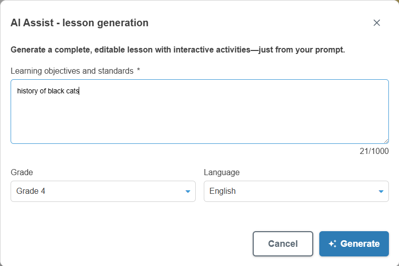 Save time by generating lessons with Lumio’s AI lesson feature. You can generate a complete, editable lesson with interactive activities just from your prompt.