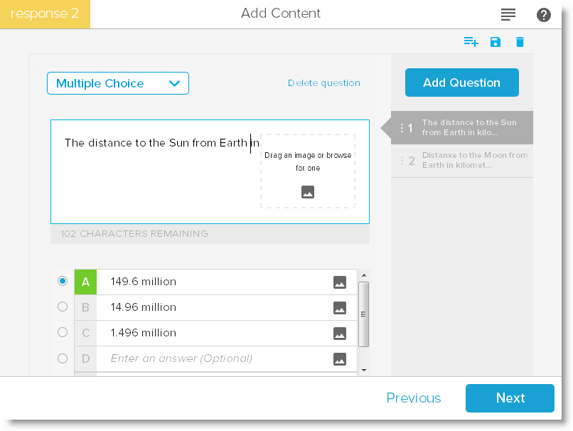 Verwenden Sie den "Response 2"-Assistenten, um umsetzbare Fragensätze zu erstellen. Diese auf fortwährende Leistungsevaluierung ausgerichtete Funktion unterstützt Pädagogen darin, die Schülerinnen und Schüler effektiv zu bewerten und sie in ihrem Lernprozess zu begleiten. Schülerinnen und Schüler, die mit ihren Mobilgeräten arbeiten, greifen über hellosmart.com auf Prüfungen zu.