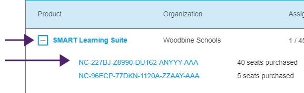Cherchez votre abonnement à SMART Learning Suite et développez-le pour afficher la clé produit.